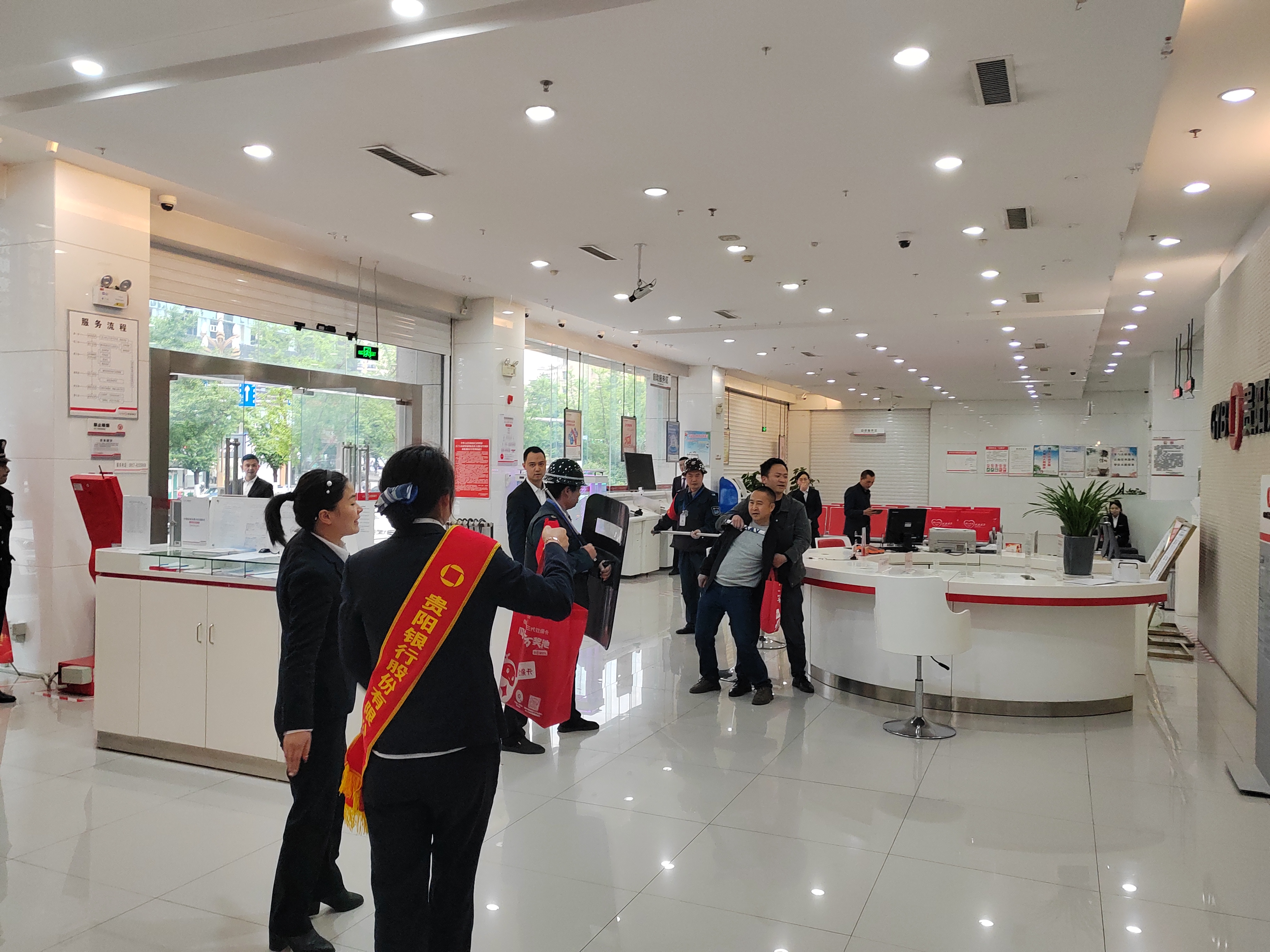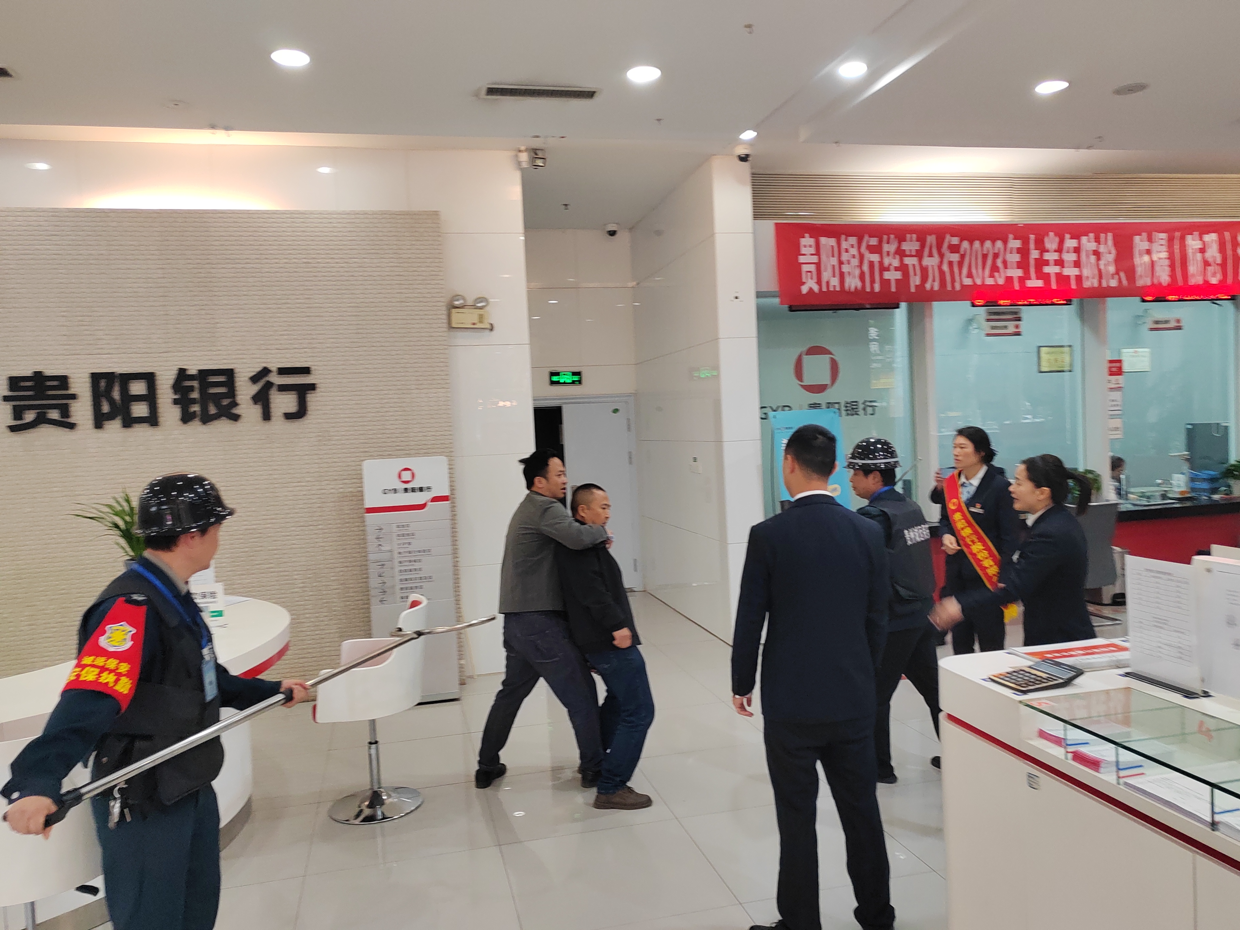 为进一步提升贵州诚远保安服务有限责任公司派驻贵阳银行毕节分行全体保安队员安全意识和处置突发事件的能力,有效地预防恶性暴力事件的发生,保证发生突发性事件时各项安全措施落到实处,我司于2023年5月10日15点在贵阳银行毕节分行展开了防暴器材的培训以及防抢、防暴实地演习活动。