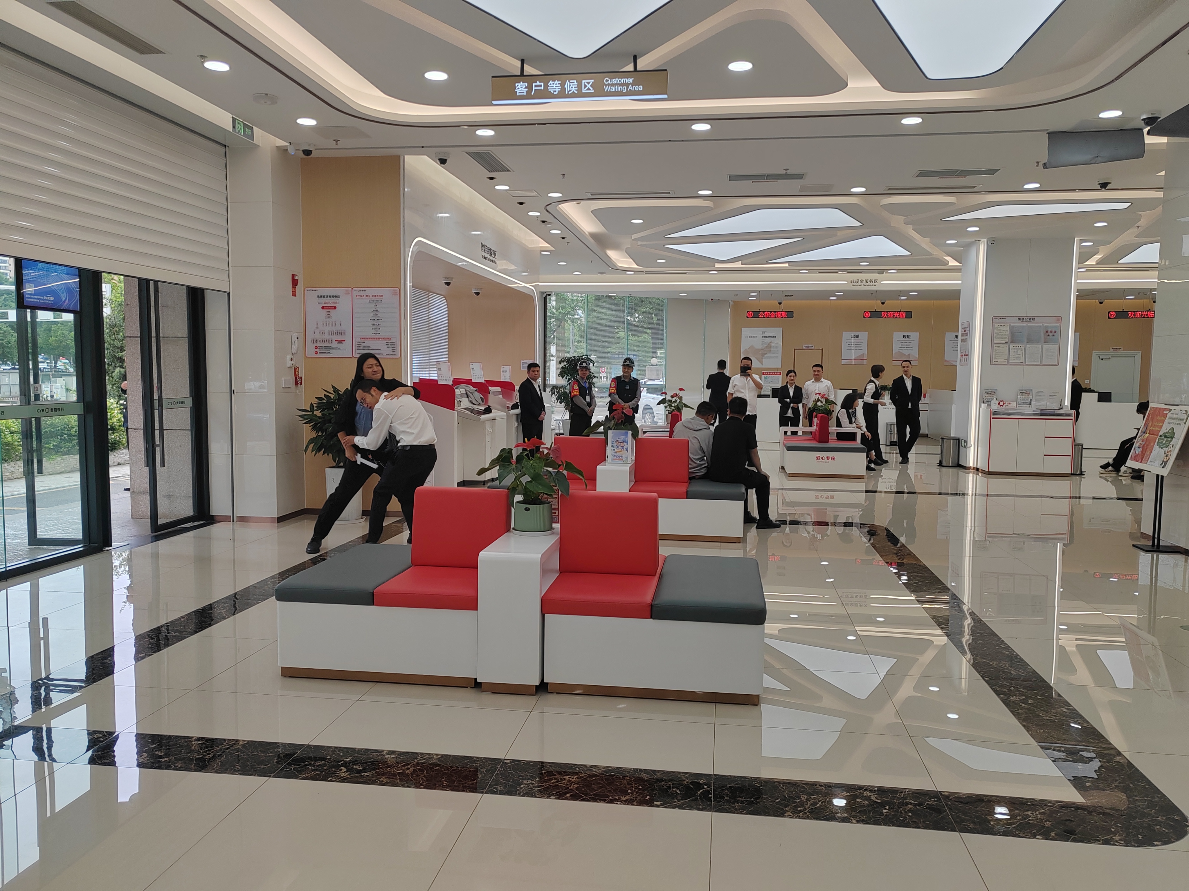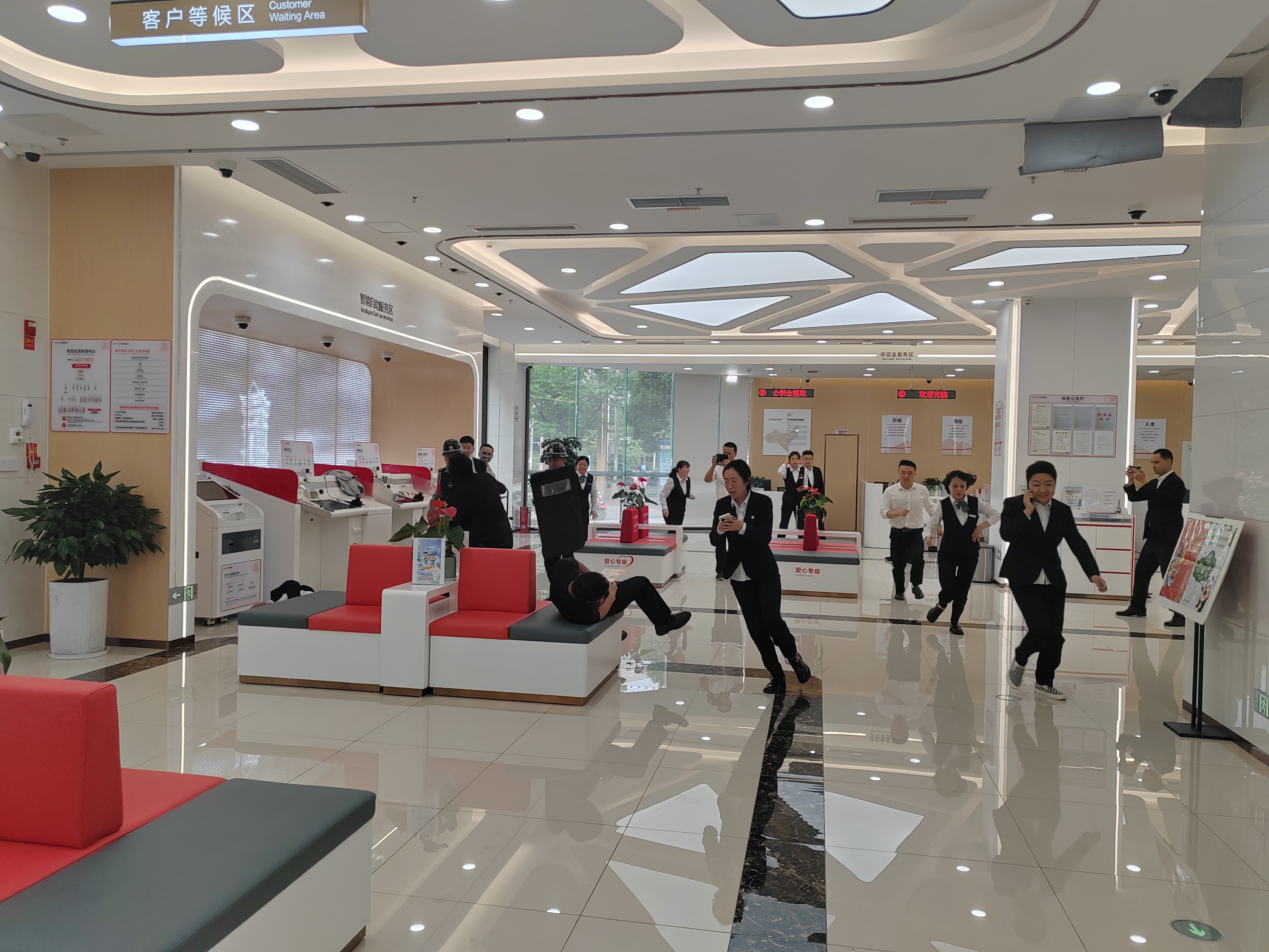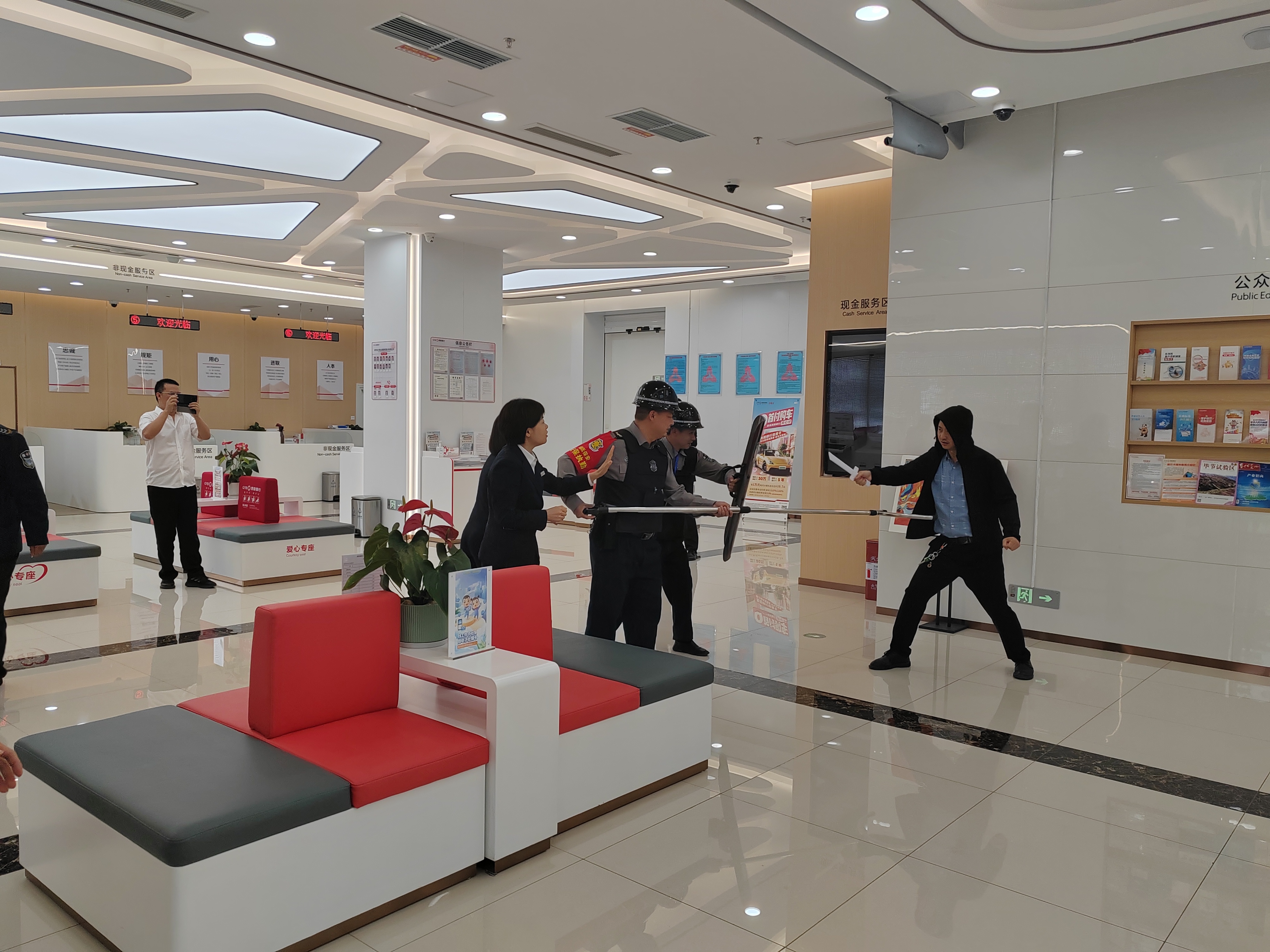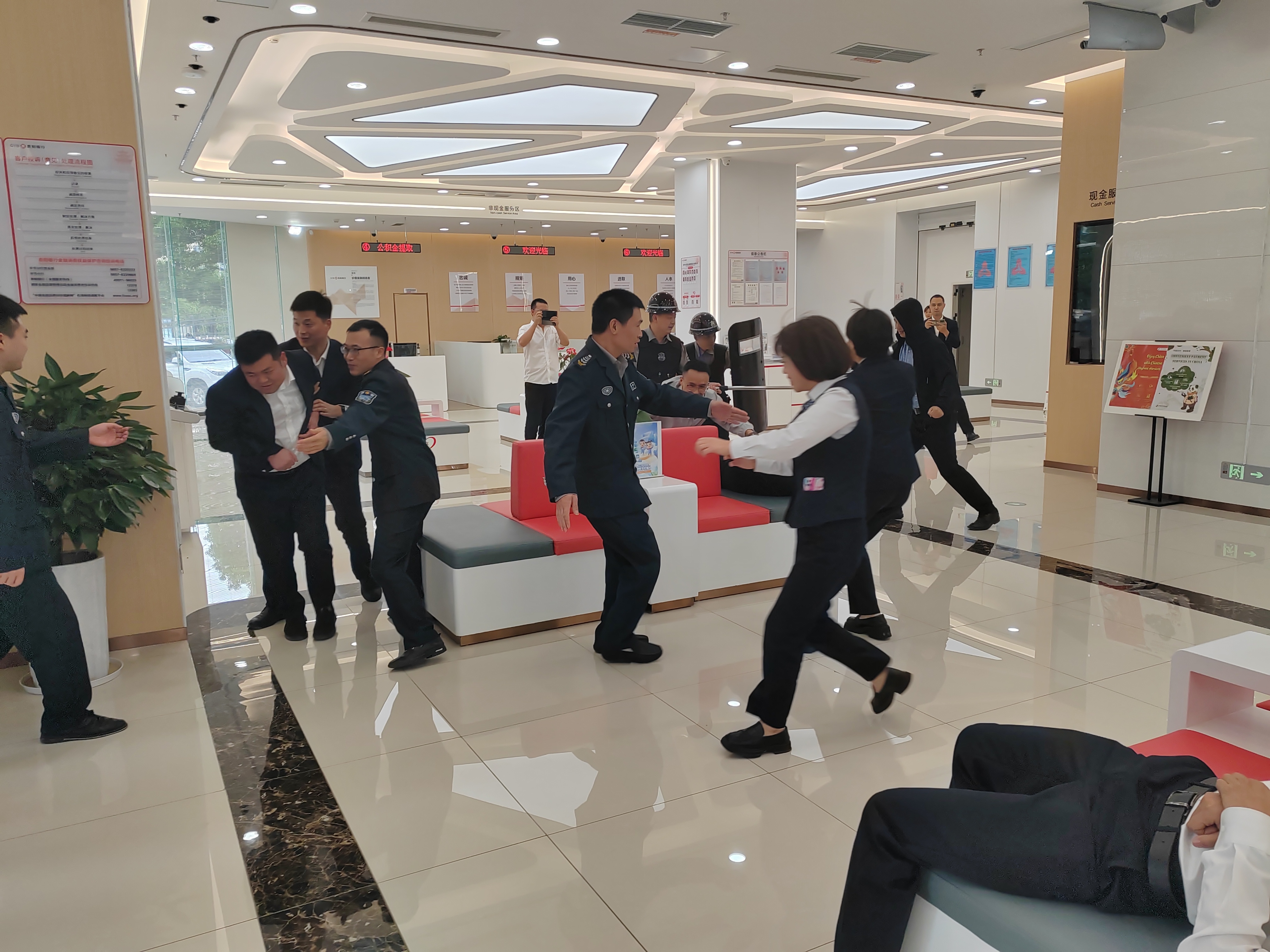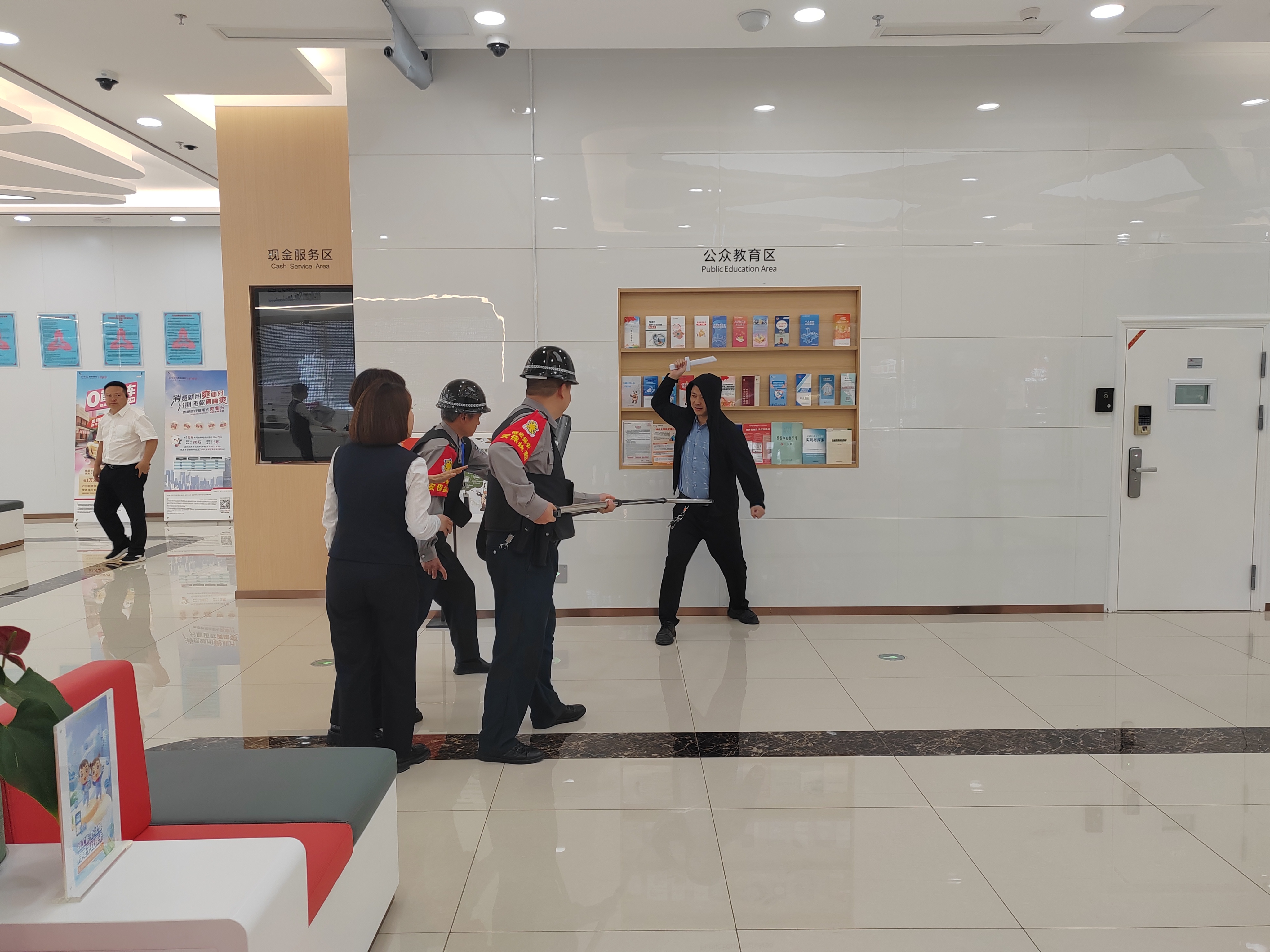 此次演练以银行营业厅发生“暴恐人员持刀抢劫”为模拟情景,为使演练达到预期目标,公司领导从演练策划、前期准备、组织实施到正式演练所经历的各个阶段,都给予了很大的关心、支持和帮助。