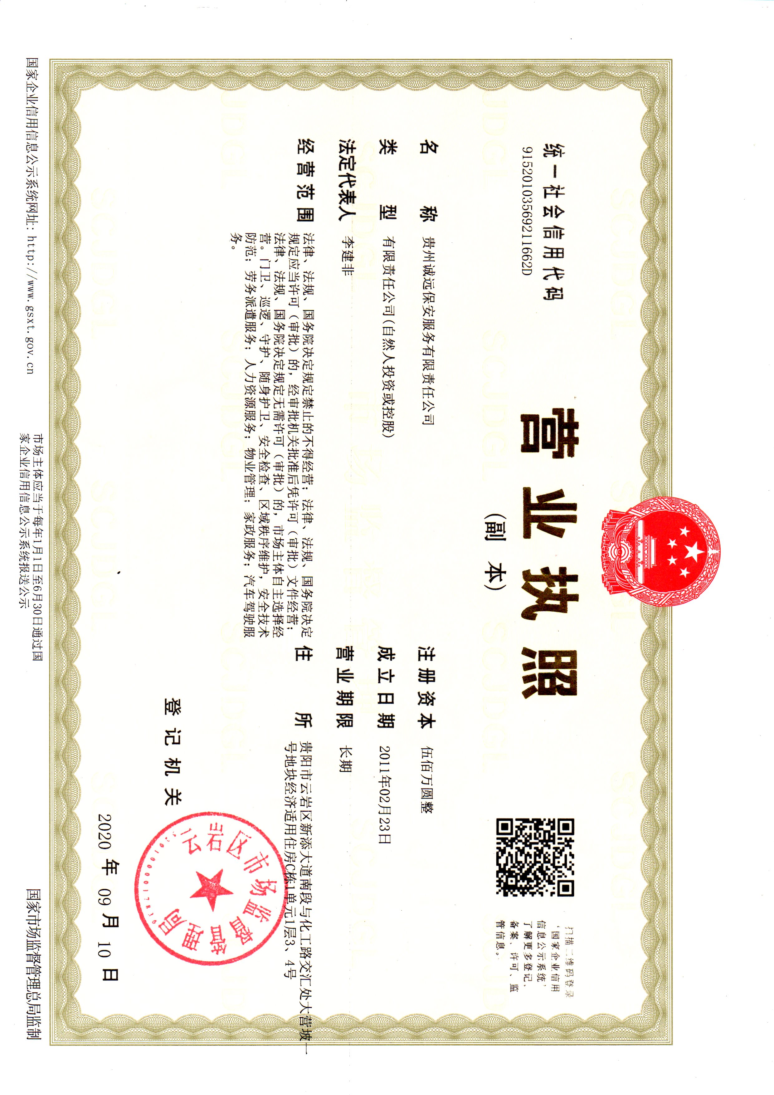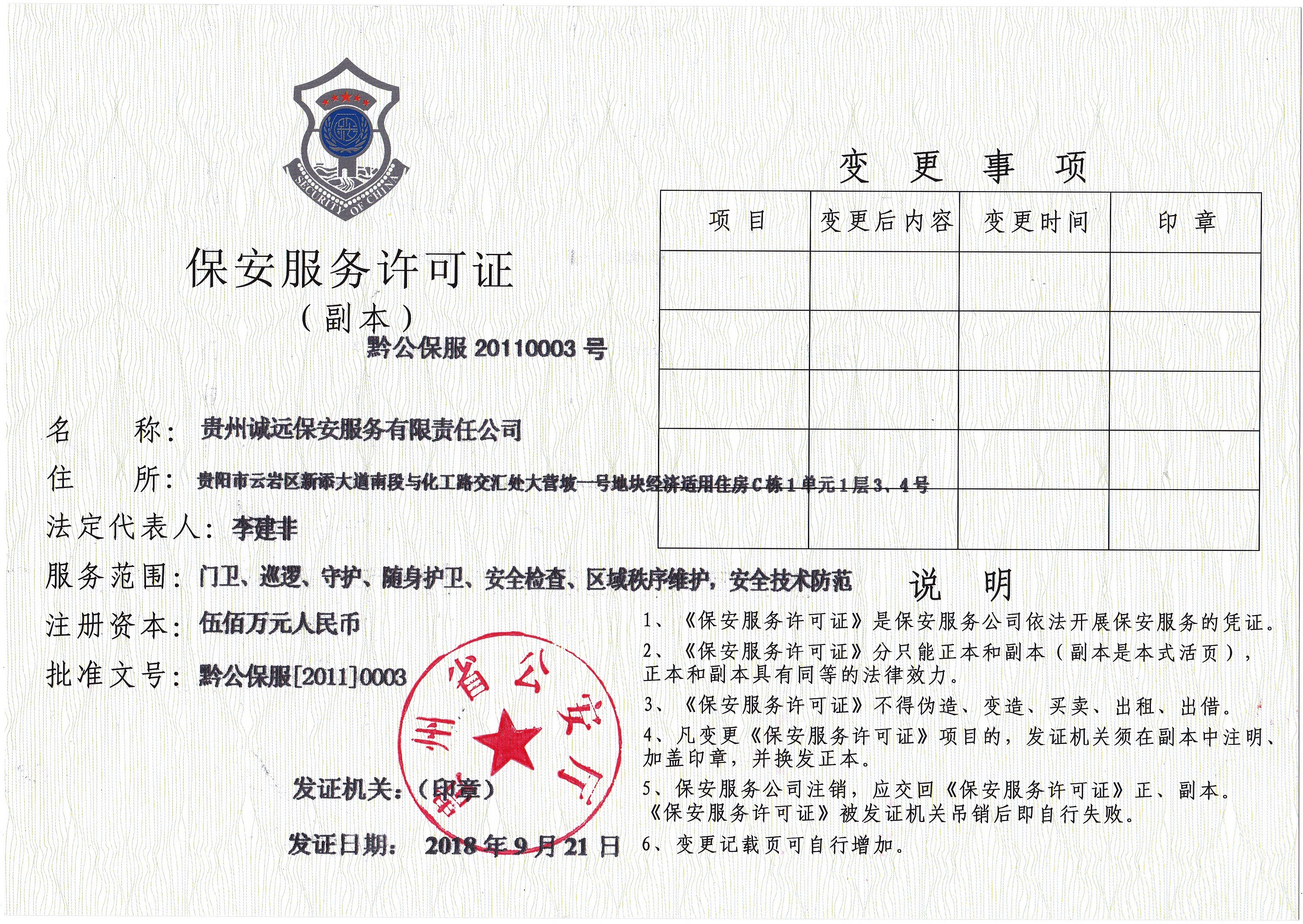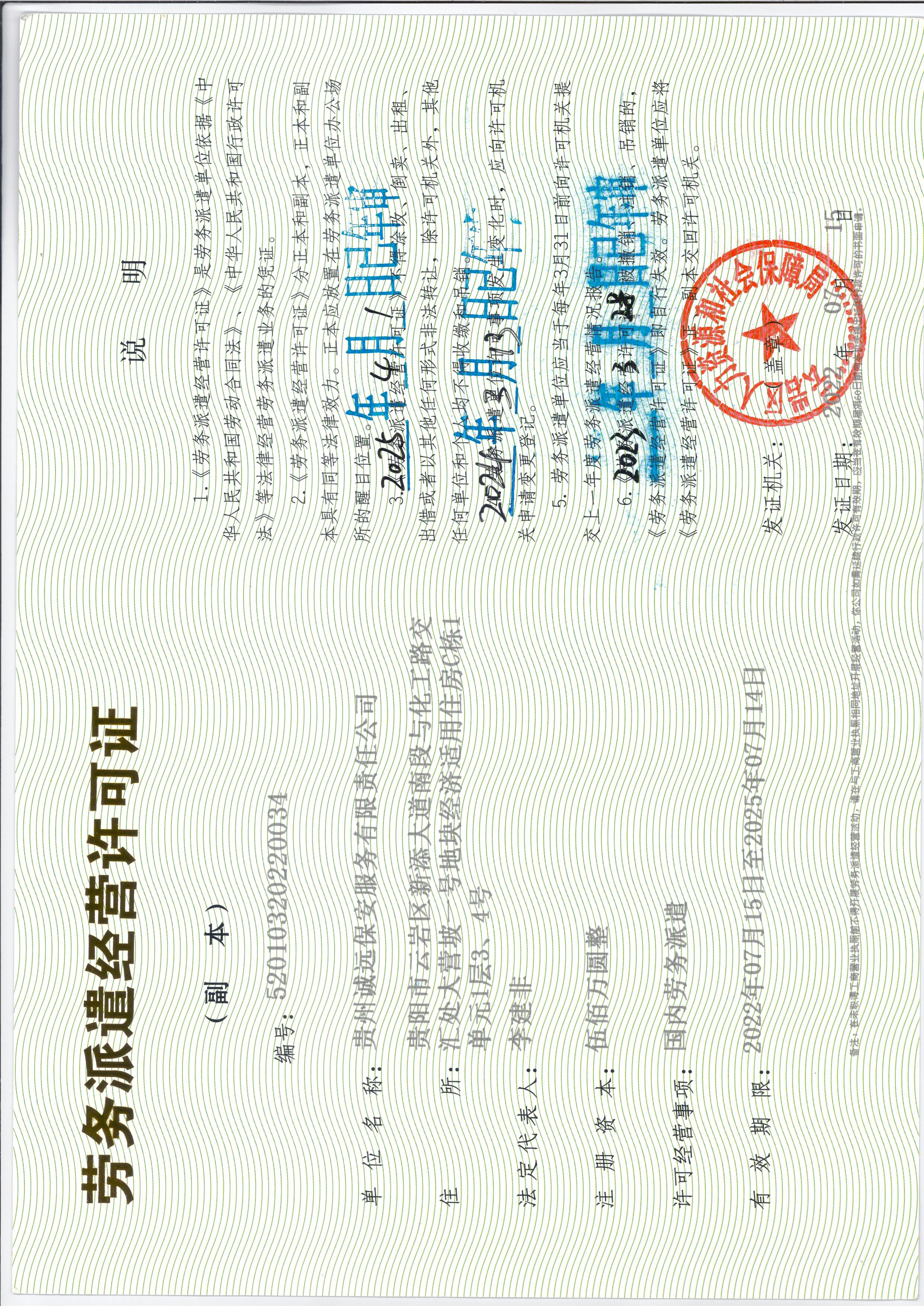 具有保安服务许可证、环境管理体系认证证书、劳务派遣经营许可证、人力资源服务许可证、职业健康安全管理体系认证证书、质量管理体系认证证书等证书
