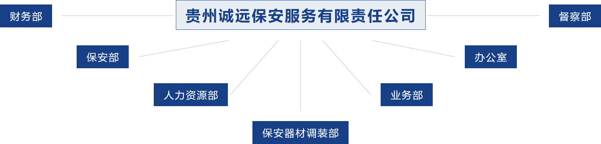 公司下设人力资源部、 财务部、 保安部、督察部、保安器材调装部.、业务部、办公室等七大部门。管理人员28人,其中本科文凭4人,大专7人,中专17人,全公司共有共产党员12